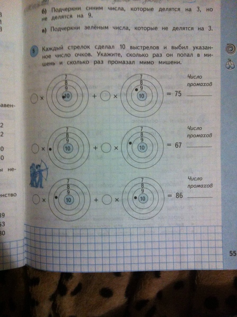 Подставляя в маленькие кружочки любые числа, но так, чтобы в одной строчке сумма цифр в двух кружочках была равна десяти. Потом цифру первого кружочка умножаешь на количество очков, указанных на мишени и складываешь с произведением второго кружочка и количества очков. Потом из полученного числа вычитаешь конечный результат, и это будет кол-во промахов. Например в первом: 5*10+5*9=75, значит 20 промахов. Во втором 3*7+7*8=67, значит промахов 11. А в третьем 8*8+9*2=86, а значит промахов 0
