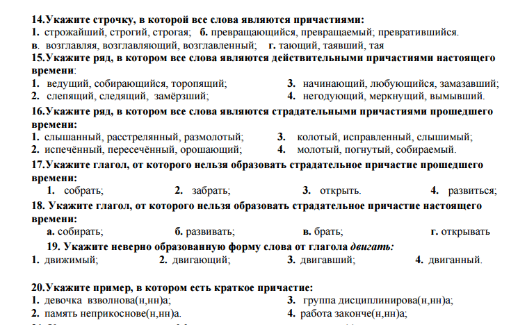 14Б (в А все прилагательные, в В и Г "возглавляя" и "тая" соответственно - деепричастия); 15-1 ( в 2 "замёрзший" - прилагательное, в 3 "замазавший" - прошедшего времени, в 4 "вымывший" - прошедшего времени); 16-1 (в 2 "орошающий" - действительное, в 3 "слышимый" - настоящего времени, в 4 "собираемый" - настоящего времени); 17-4 (так как глагол "развиться" непереходный); 18В (так как глагол "брать" - исключение); 19Г (глагол "двигать" 1го спряжения, а суффикс анн/янн используется для образования страдательных причастий настоящего времени от глаголов 2го спряжения; к тому же этот глагол является исключением); 20-4 (действие протекает во времени; вообще, верным будет являться и вариант 20-1, но указать требуется только один пример). ОТВЕТ: 14-Б, 15-1, 16-1, 17-4, 18-В, 19-Г, 20-4.
