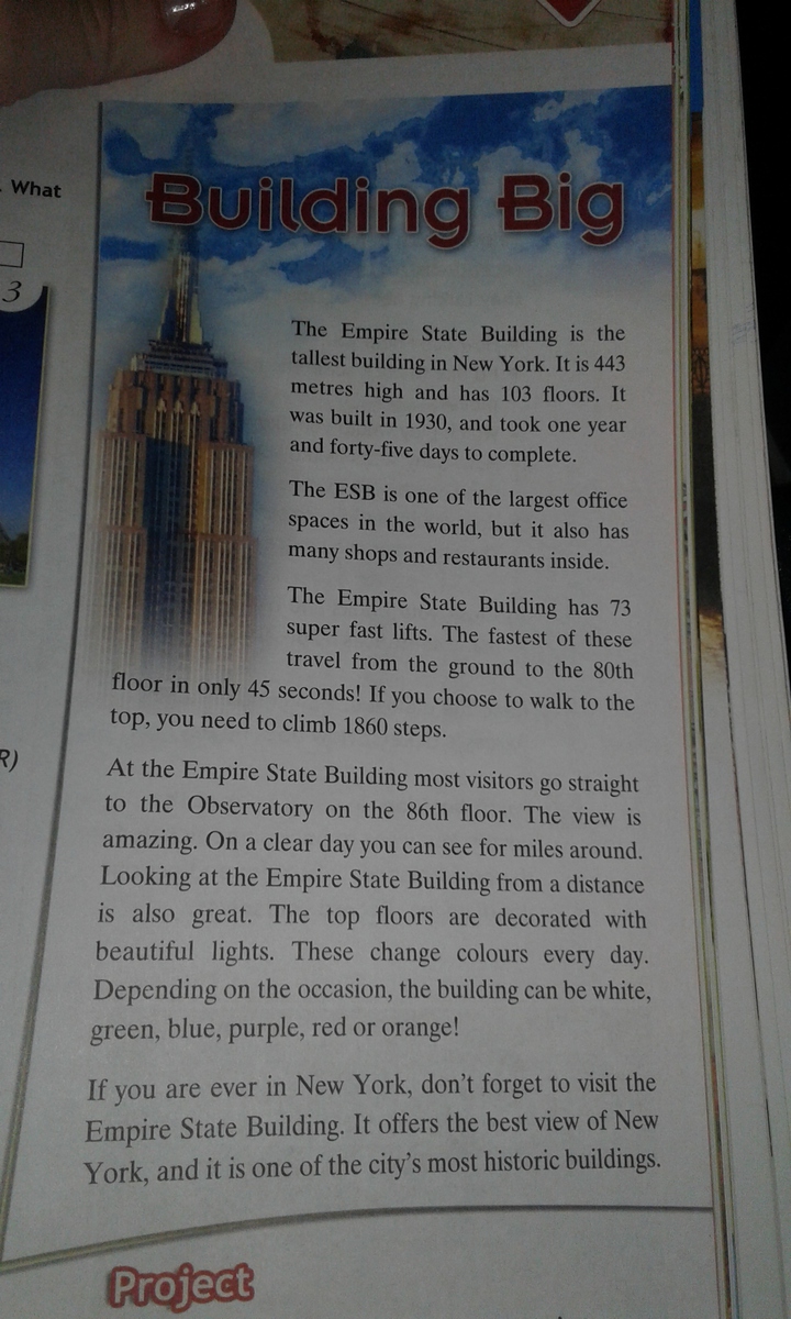 (Название) это самое длинное здание в Нью-Йорке. Оно 1443 метра в высоту и имеет 103 этажа. Было построено в 1930, закончено за 1 год 45 дней. Это одно из самых больших офисных зданий во всем мире, также в этом здании есть магазины и пара ресторанов.