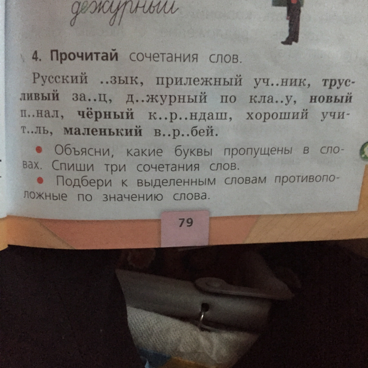 Русский язык, прилежный ученик, трусливый заяц, дежурный по классу, новый пенал, черный карандаш, хороший учитель, маленький воробей.