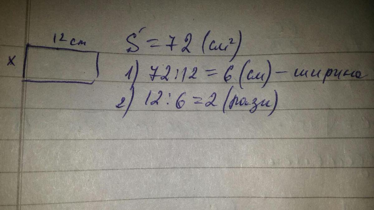 площа прямокутника 72 см квадратних.довжина - 12 см. у скільки разів ширина прямокутника менше від його довжини