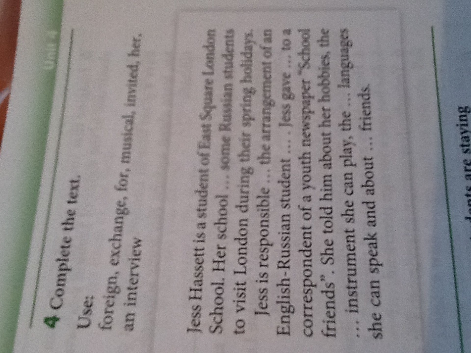 Jess is responsible for the arrangement of an English-Russian student exchange. Jess gave an interview to a correspondent of a youth newspaper "School friends". She told him about her hobbies, the musical instrument she can play, the foreign languages she can speak and about her friends.