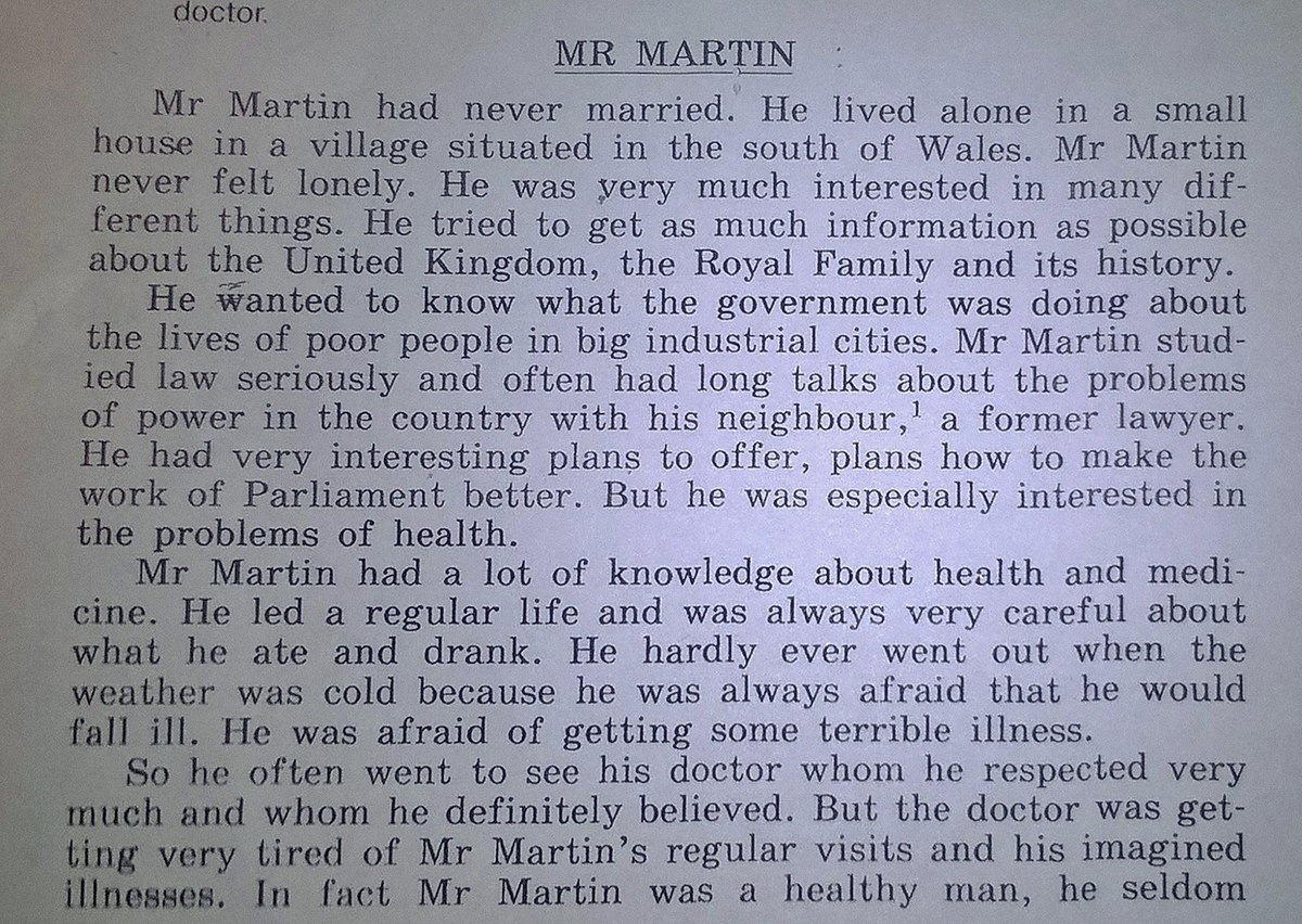 г-н Мартин никогда не был женат. Он жил один в маленьком домике в деревне, расположенной на юге Уэльса. Г-н Мартин никогда не чувствовал себя одиноким. Он был очень заинтересован во многих вещах ных. Он пытался получить как можно больше информации, сколько возможно о Соединенном Королевстве, королевской семьи и ее истории. Он хотел бы знать, что правительство делает о жизни бедных людей в крупных промышленных городах. Г-н Мартин изученный закон серьезно и часто имели долгие разговоры о проблемах власти в стране со своим соседом, бывший адвокат. У него были очень интересные планы предложить, планы, как сделать работу парламента лучше. Но он был особенно заинтересован в проблемах здоровья. Г-н Мартин имел много знаний о здоровье и Medi киношной. Он вел нормальный образ жизни и всегда был очень осторожен о том, что он ел и пил. Он почти никогда не выходил, когда погода была холодной, потому что он всегда боялся, что он заболеет. Он боялся получить какую-то страшную болезнь. Таким образом, он часто ходил к своему врачу, которого он уважал очень много и с кем он, безусловно, верил. Но доктор был получить тин очень устал от регулярных визитов г-на Мартина и его воображаемых болезнь закончилась. На самом деле г-н Мартин был здоровым человеком, он редко простудился, он никогда не имел головную боль, боль в ухе или боли в желудке. Но он думал, что у него были все мыслимые болезни Однажды г-н Мартин поспешила в кабинет врача и сказал ему, что он был уверен, что у него был какой-то страшной болезнью, которую он читал в газете. Он показал врач бумаги Врач внимательно прочитать его, а затем сказал: "Я удивлен, мистер Мартин, что вы думаете, у вас есть эта болезнь Там нет никаких признаков того, что у вас есть, как написано здесь, люди не '.. знаю, когда у них есть эта болезнь. являются никаких симптомов и люди, как правило, очень хорошо чувствуют. они не кашле или чихании у них нет боли в голове или в любой другой части тела, их не является нормальным не торговый центр, поэтому их кровяное давление. Это Безразлично? быть им двигаться, дышать или глотать. Так что, пожалуйста, дон глупо. Вы не должны беспокоиться г-н Мартин был оскорблен "Но это только, как я чувствую, доктор. Я не страдаю от всех этих вещей тоже
