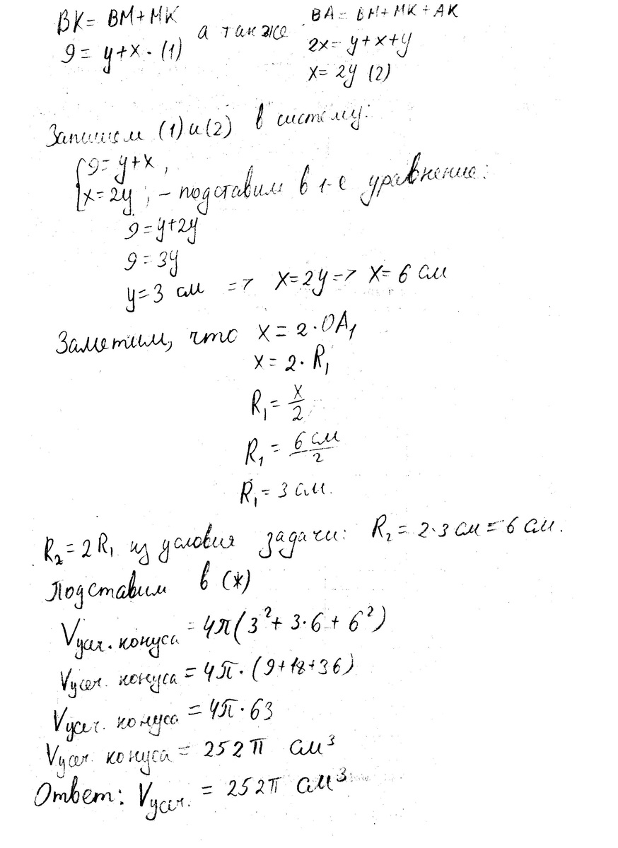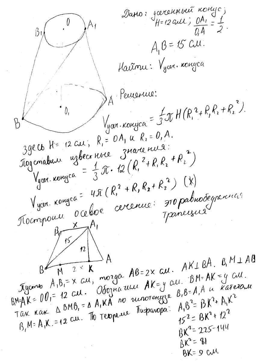 Радиусы оснований усеченного конуса относятся как 1:2. Диагональ осевого сечения равна 15 см. Высота равна 12 см. Найти объём усеченного конуса.