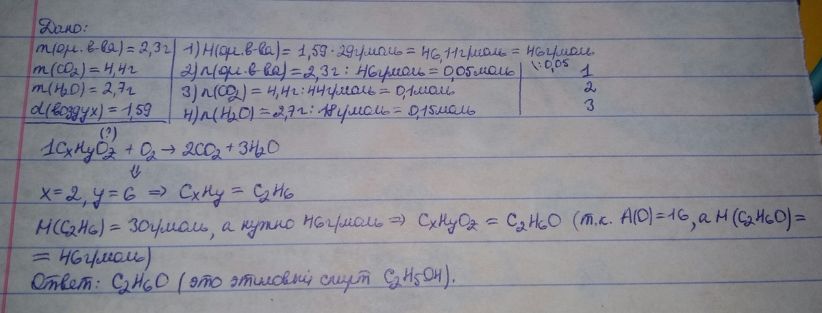 Помогите!!!!!при сгорании 2,3 г вещества образовалось 4.4 г оксида углерода(IV) и 2.7 г воды. Относительна плотность пары за воздухом 1.59. Определить молекулярную формулу соединения.