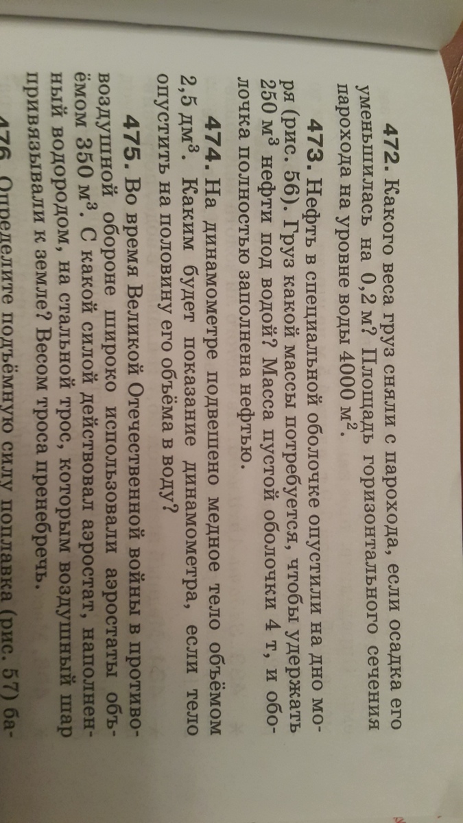 472.V( на к-рый уменьшилась осадка)=S*h; уменьшение силы архимеда=(ро воды)*V*g=(ро воды)*S*h*g=1000кг/м куб.*0,2м*4000 м кв.*10Н/кг=8*10^6H.Вес снятого груза.