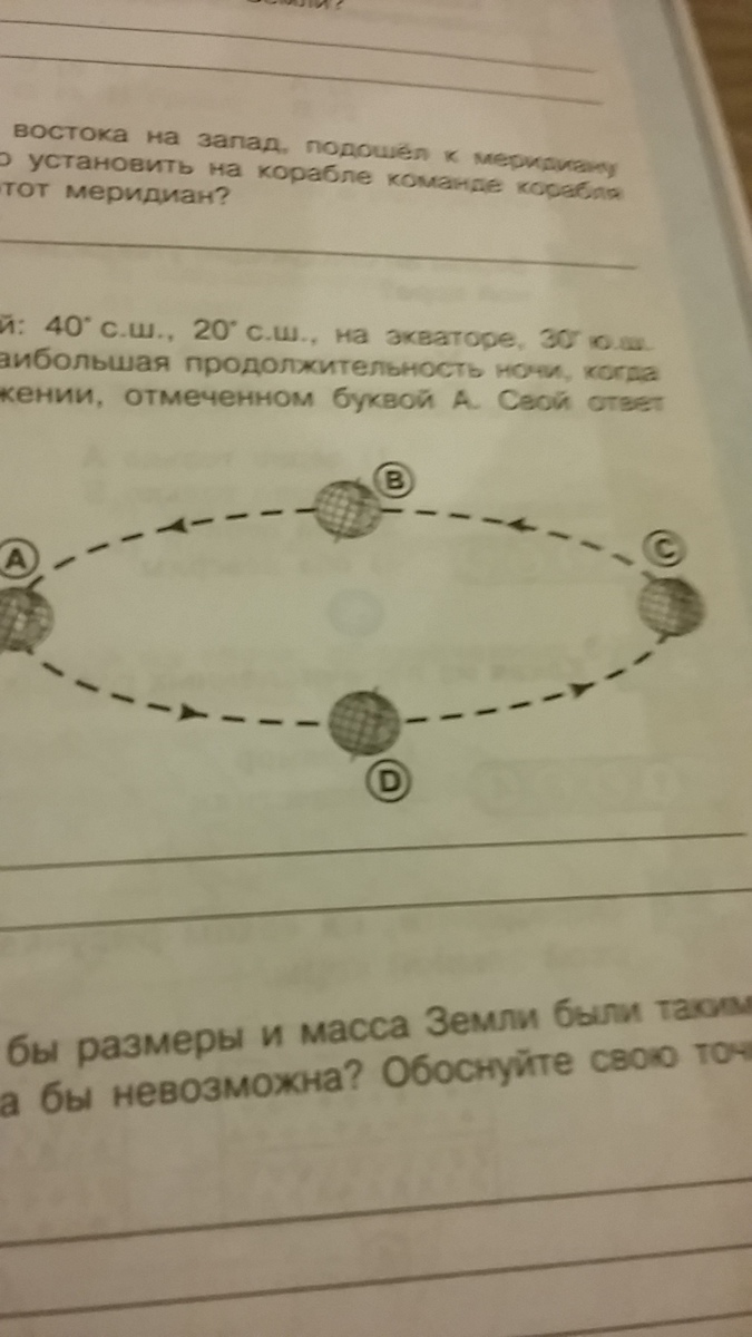 определите на какой из параллелей:40с.ш.,20 с.ш.,на экваторе,30ю.ш или50ю.ш- будет наблюдаться наибольшая продолжительность ночи,когда Земля находится на орбите в положении,отмеченной буквой А.Свой ответ обоснуй.