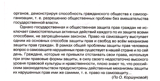 5) гражданин решил что его уровень правовой культуры достаточно высок. И поэтому он решил воспользоваться правом самозащиты в надежде применить свои права максимальным образом, дабы доказать свою невиновность. об этом и говорится в последнем абзаце текста.
