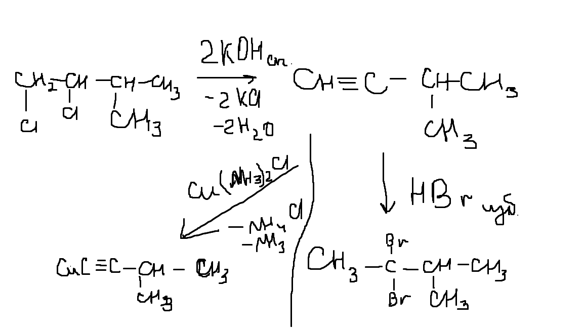 Напишите уравнение реакции получения 3-метилбутина-1 из соответствующего дагалогеноалкана. Напишите для алкина ур.реакций: а) с избытком HBr б) с аммиачным раствором CuCl.