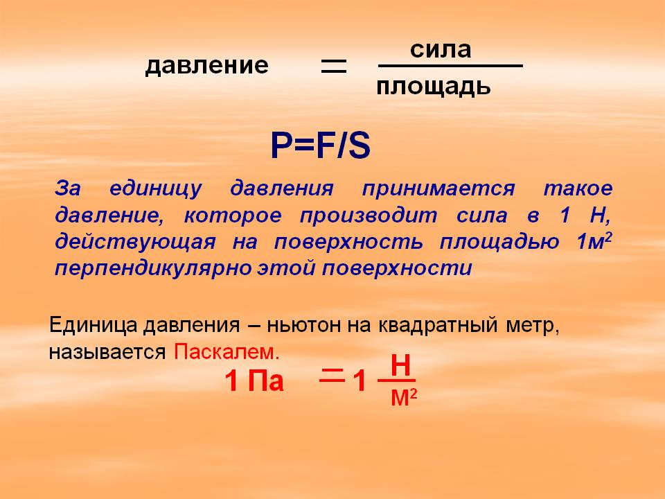 Один Паскаль(мера измерения давления)= Один Ньютон(мера измерения любой силы) на один метр в квадрате (площадь поверхности, на которую действует данная сила)