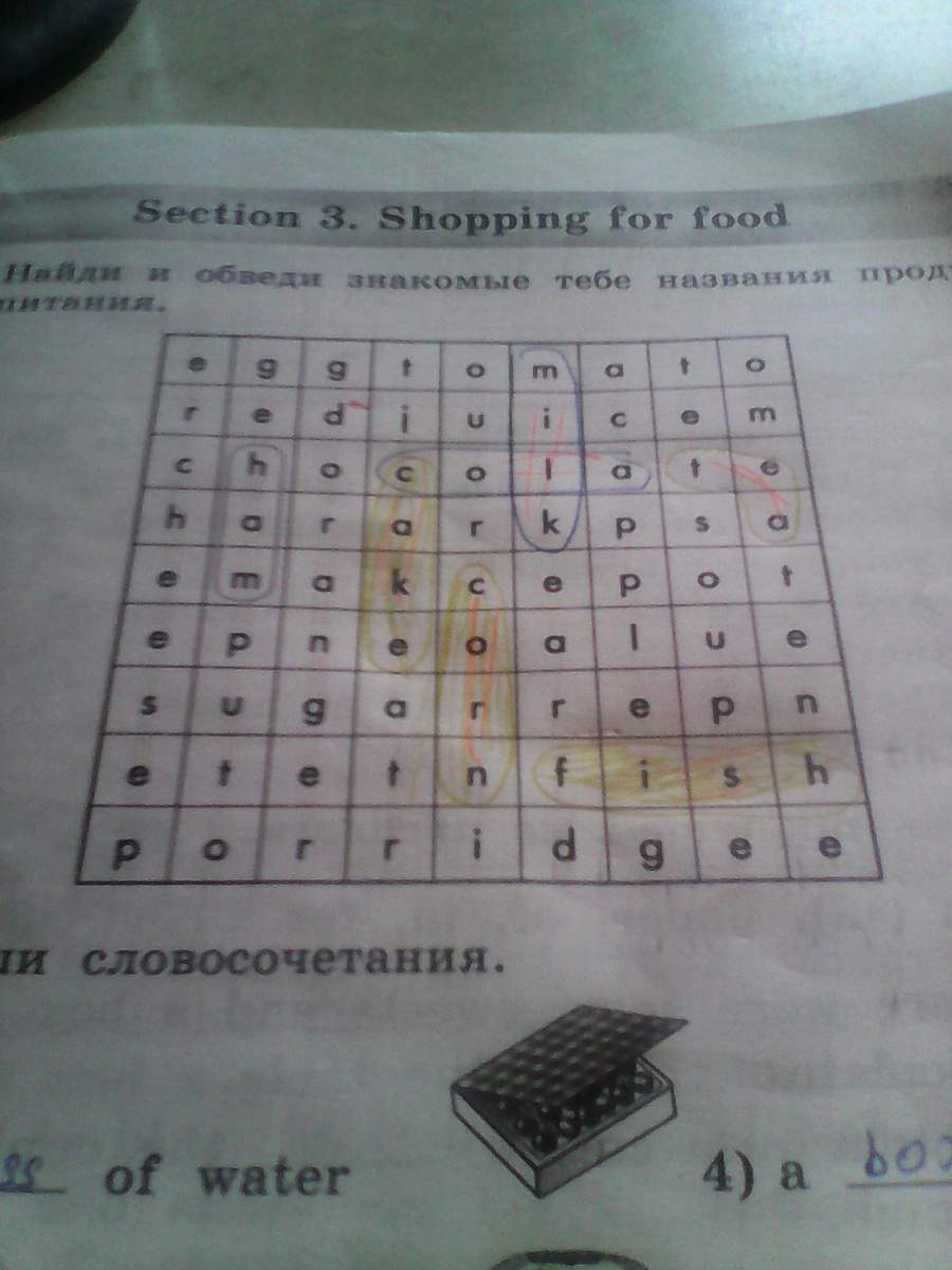 Porridge на самой нижней стр, orange между cake и ham, cheese слева, sugar возле ham, soup возле tea и fish ,tomato сверху