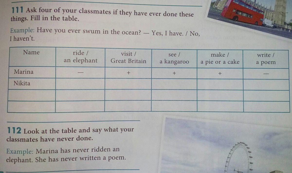 имя, кататься на слонах, посетить Великобританию, видеть кенгуру, сделать пирг или торт, написать поэму