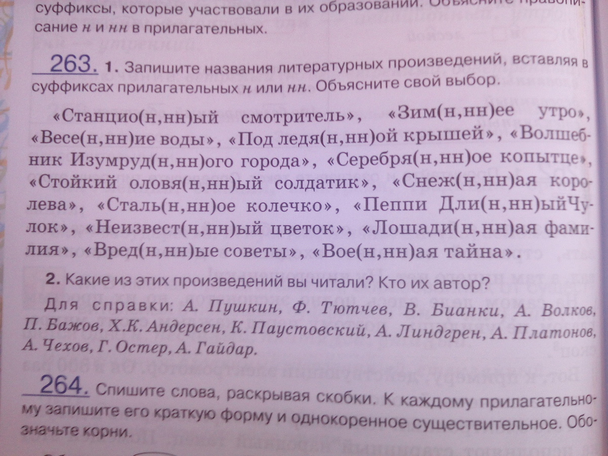 Станционный смотритель (онн суффикс ) , Зимнее утро (),Весенние воды (весен - корень,н - суффикс),Под ледяной крышей (ян-суффикс),Волшебник изумрудного города(н- суффикс ), Серебряное копытце (ян-суффикс) ,Стойкий оловянный солдатик (исключение суффикс - янн),снежная королева (снеж - корень, н- суффикс),Стальное колечко (сталь-корень,н-суффикс),Пеппи длинный чулок (длин-корень, н-суффикс),неизвестный цветок (извест-корень, н-суффикс ),Лошадиная фамилия (ин-суффикс ),вредные советы (вред-корень, н-суффикс ), военная тайна (воен-корень, н- суффикс )