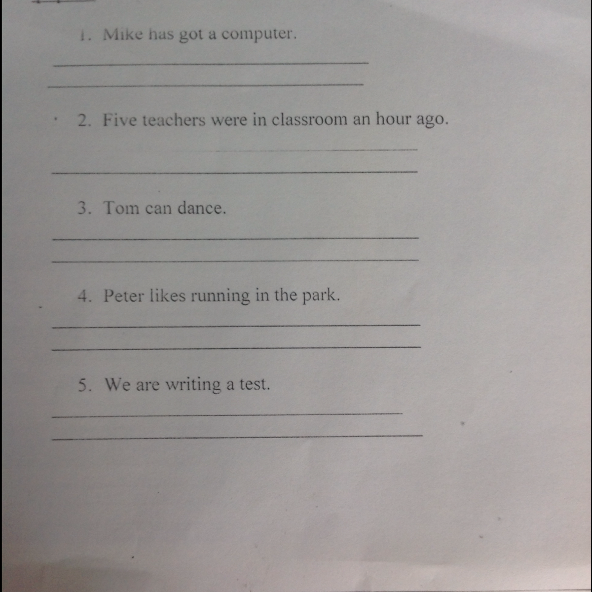 2. Five teachers were not in classroom an hour ago/ Were five teachers in classroom an hour ago? Where were five teachers an hour ago?