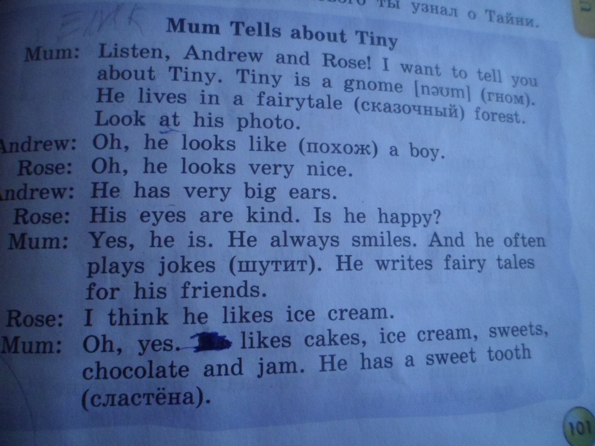 Лисэн, Андрей энд Роуз! Ай уонт ту тел ю эбаут Тини. Тини из э гноум. Хи ливс ин э фэаритэйл форэст. Лук эт хис фотоу. Оу, хи лукс лайк э бой. Оу, хи лукс вэри найс. Хи хэз вери биг иарс.Хис айс а кайнд. Ис хи хэппи? Ес, хи из. Хи олвэйс смайлс. Энд хи оуфен плэйс джокес. Хи райтс вэри тэйлс фор хис фрэндс. Ай синк ни лайкс айс крим. Оу, ес. Хи лайкс кейкс , айс крим, суитс, чоколэйт энд джэм. Хи хэз э суит тус.