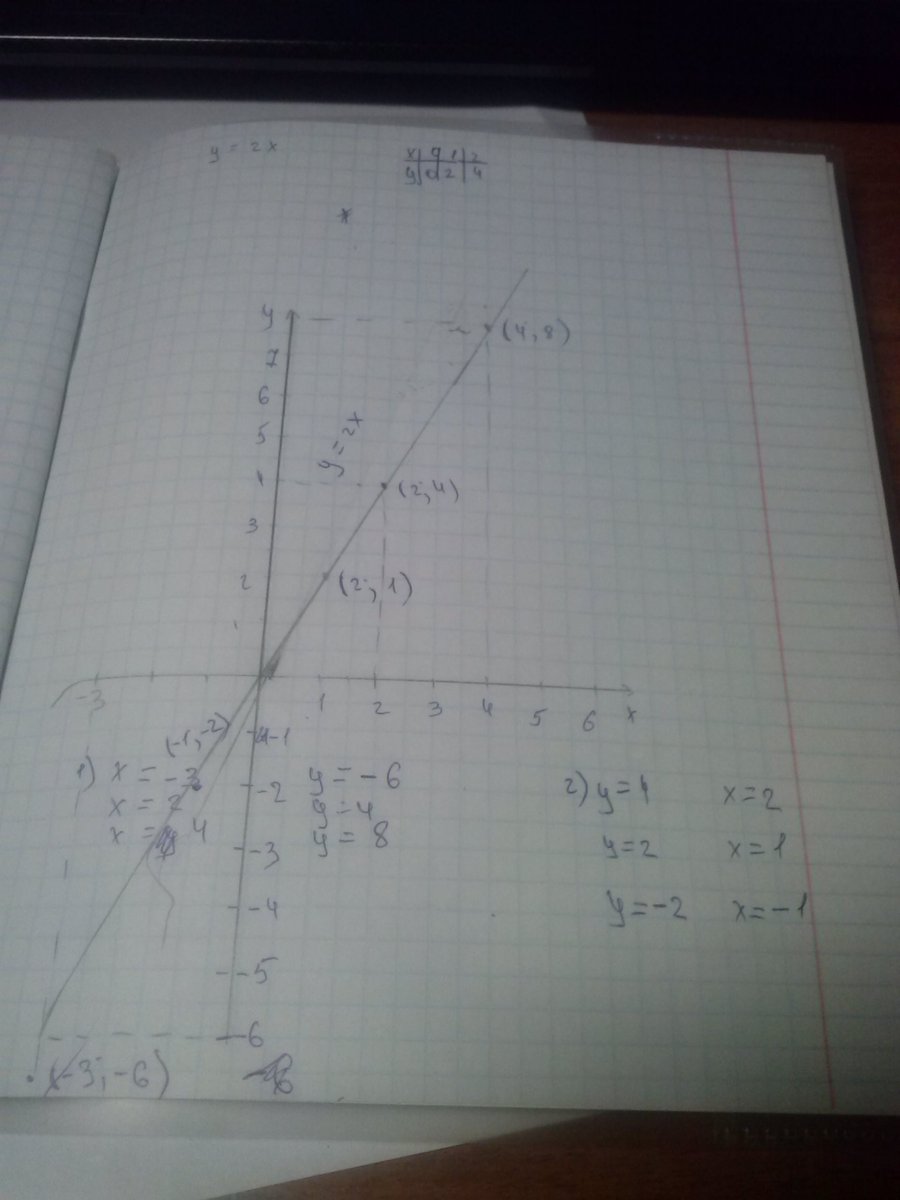 постройте график прямой пропорциональности у=2х.найдите: 1)значение функции,соответствущеезначению аргумента,равному -3;2;4; 2)значение аргумента,которому соответствует значение функции,равному 4;2;-2