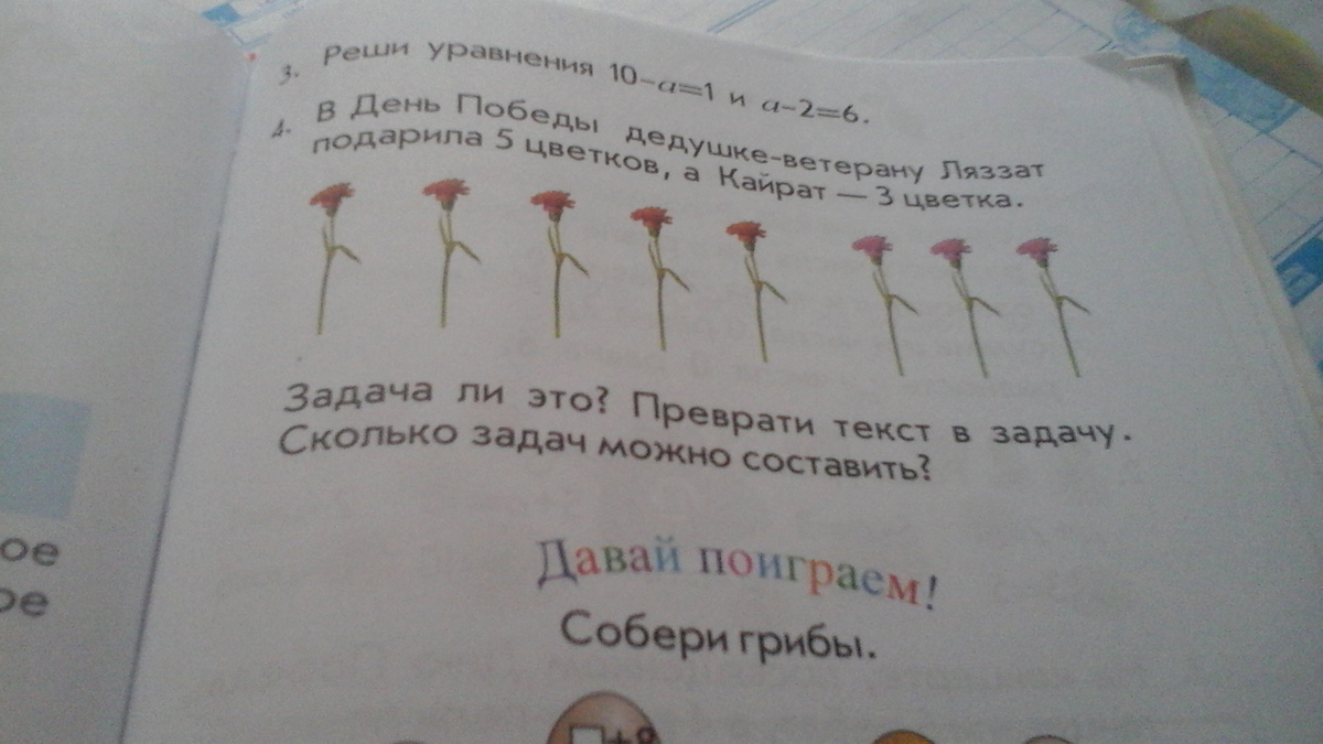 Это задача. Мой возможный вариант: В день победы дедушке-ветерану Ляззат подарили 5 цветко, а Кайрат - 3 цветка. Сколько им подарили в общем? или В день победы дедушке-ветерану Ляззат подарили 5 цветко, а Кайрат - 3 цветка. На сколько цветков больше подарили дедушке Ляззат?