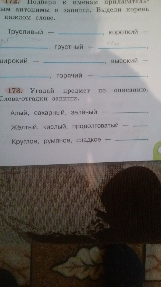 Алый, сахарный, зеленый - арбуз. Желтый, кислый, продолговатый - лимон. Круглое, румяное, сладкое -яблоко