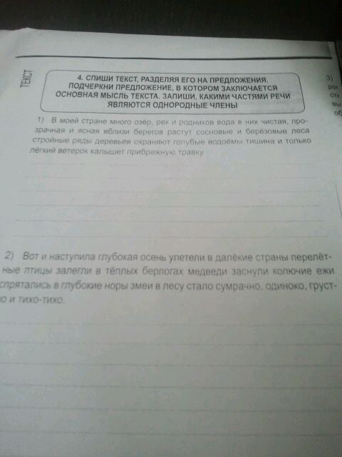 1)в моей стране много озер, рек и родников. 2)вода в них чистая, прозрачная и ясная. 3)вблизи берегов растут сосновые и берёзовые леса. 4)стройные ряды деревьев охраняют водоёмы. 5)тишина. 6)и только лёгкий ветерок калышет прибрежную травку. смысл в предложении 5)