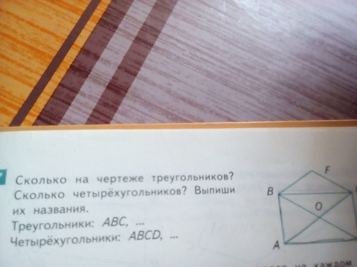 Сколько на чертеже треугольников? Сколько четырёхугольников? Выпиши названия.
