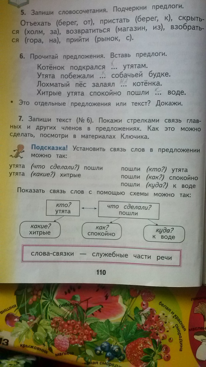 Котёнок пробрался (к кому?) к утятам. Крестик над котёнок и стрелочка к утятам.