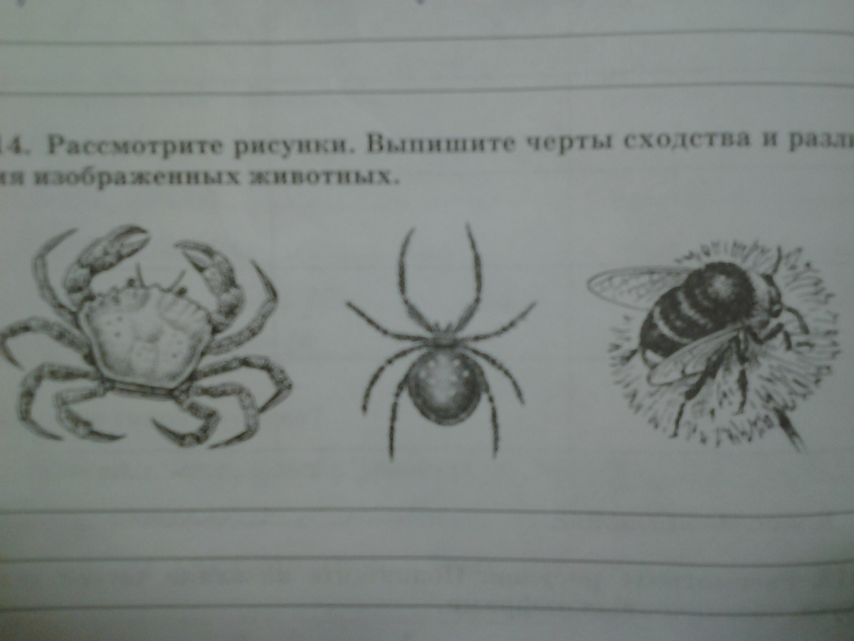 Паук — паукообразный , пчела она — наскекомая , краб — это высшие крабы.Ещё они могут отличаться не только по этому но и ножками: у краба 5 пар 2 у краба это клещни , у паука 4 пары , 3 пары у пчелы.Ещё может быть различия в том что разные покровы туловища, они разно пиредвигаються, добывания пищи.Сходство в том что наверное у них есть туловище , голова.