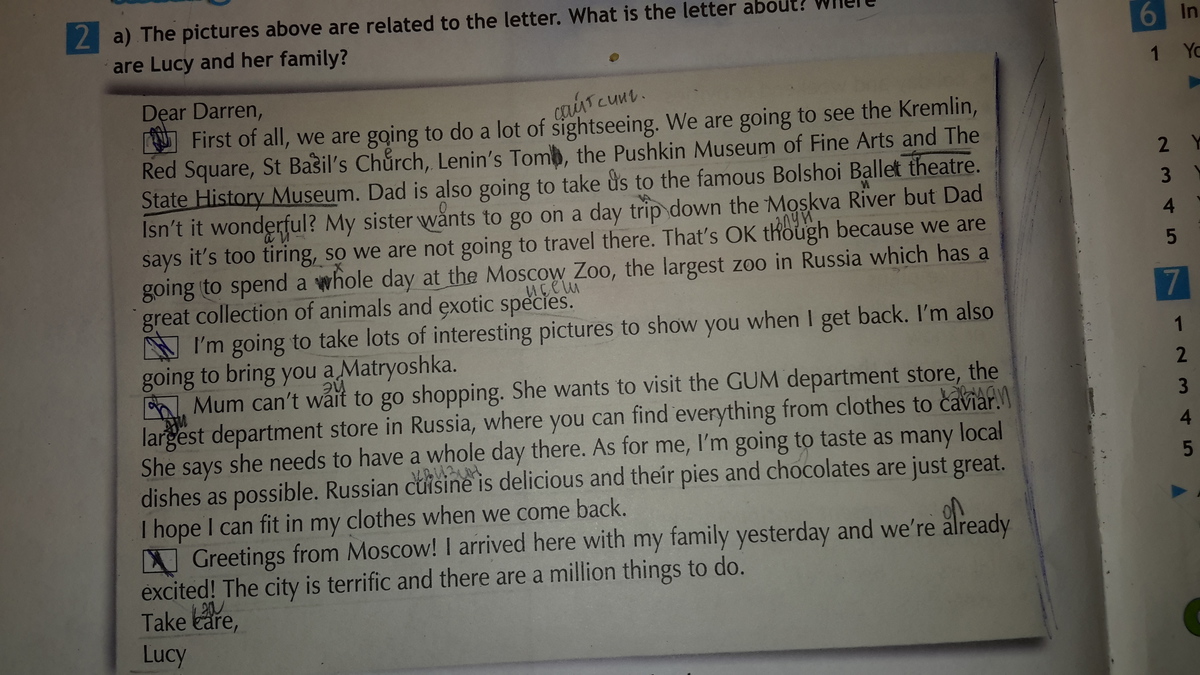 Мама не может дождаться, чтобы пойти за покупками. Она хочет посетить универмаг ГУМ, самый большой универмаг в России, где ты можешь найти все от одежды до икры. Она говорит, что ей нужно провести целый день там. Что касается меня, то я собираюсь попробовать так много местных блюд, сколько возможно. Русская икра вкусная и их пироги и шоколад просто замечательные. Я надеюсь, я смогу влезть в мою одежду, когда мы вернемся.
