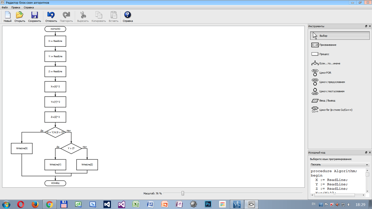 Построить блок-схему алгоритма нахождения квадрата минимального значения среди трёх чисел x, y, z.