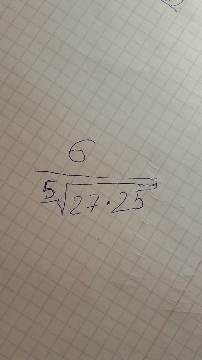 frac{6}{ sqrt[5]{27*25} } = frac{ 6^{5} }{( sqrt[5]{27*25}) ^{5} } = frac{7776}{27*25} = frac{7776}{675} =11 frac{351}{675} =11 frac{39}{75} =11 frac{13}{25}