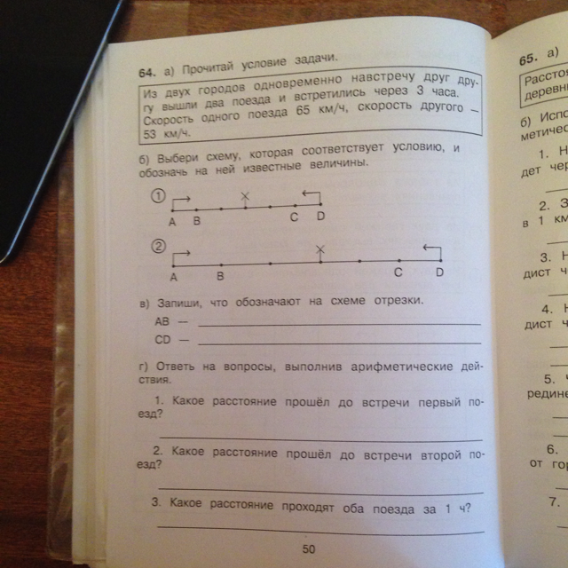 б-2, В- АВ-пройдет первый поезд за 1 час СD- пройдет второй поезд за 1 час Г- 1) 65*3=195(км) 2)53*3=153(км) 3)65*1+53*1=118(км) (*-это умножение)
