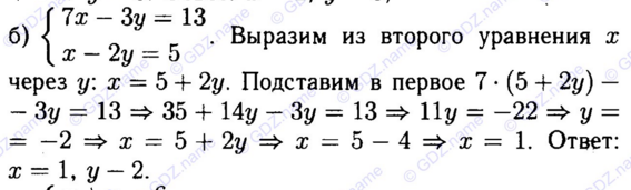 Это решение методом подстановки. Мы должны из какого-либо уравнения выразить х или у (что будет удобнее выражать). И подставить в другое уравнение, решая относительно одной переменной. Затем подставляем найденное значение в первое уравнение.