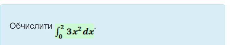 intlimits^2_0 {3 x^{2} } , dx =3* frac{ x^{2+1} }{2+1} | _{0}  ^{2} = x^{3} | _{0}  ^{2} = 2^{3} - 0^{3} =8