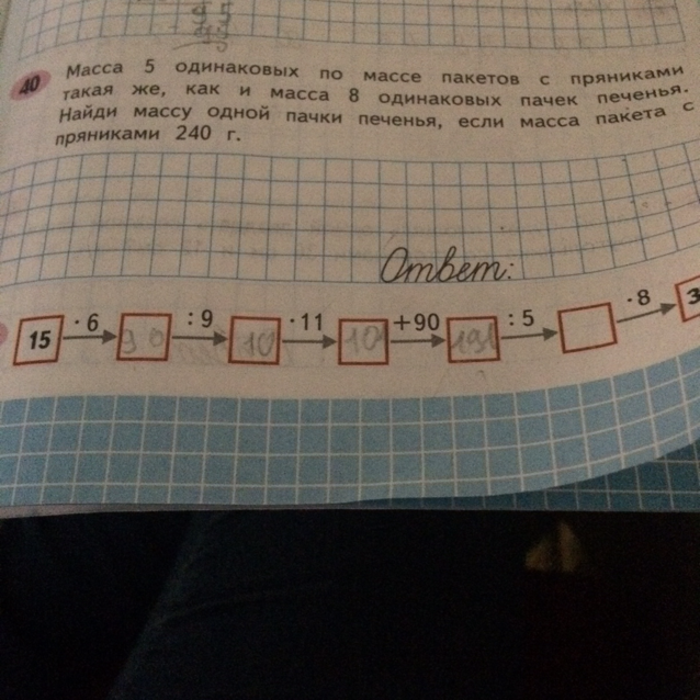 Если масса пакета с пряниками 240г то масса 5 пакетов будет 240×5=1200г.Эта масса оавна с массой 8 пачек с печеньями.Значит масса одной пачки с печеньем будет 1200/8=150г