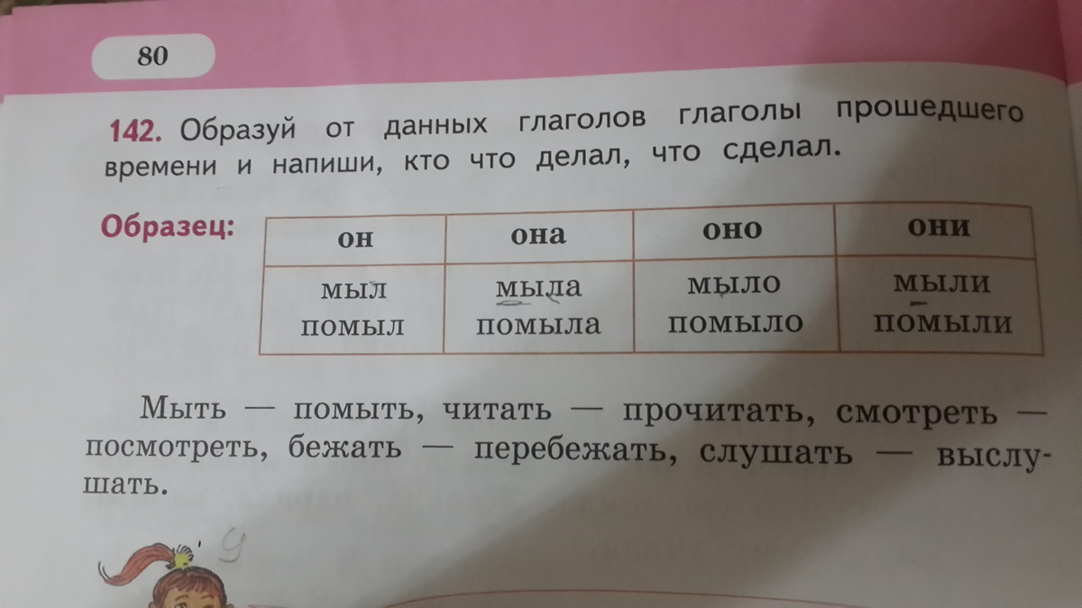 (она)мыла-помыла;читала-прочитала;смотрела-посмотрела;бежала-перебежало