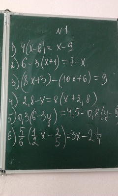 1) 4(x-6)=x-9 2) 6-3(x+1)=7-x 3) (8x+3)-(1x+6)=9 4) 2,8-x=8(x+2,8) 5) 0,3(6-3y)=4,5 -0,8(y9) 6) 5|6(1|2x-2|3)=3x-2 1|4