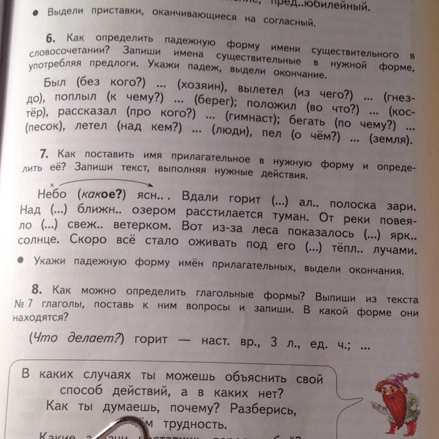 Небо (какое?)ясноЕ.Вдали горит (какая?)алАЯ полоска зари.Над (каким ?) ближнЕМ озером расстилается туман.От реки повеяло (каким?) свежИМ ветерком.Вот из-за леса показалось (какое?) яркОЕ солнце.Скоро всё стало оживать под его (какими?) тёплЫМИ лучами.