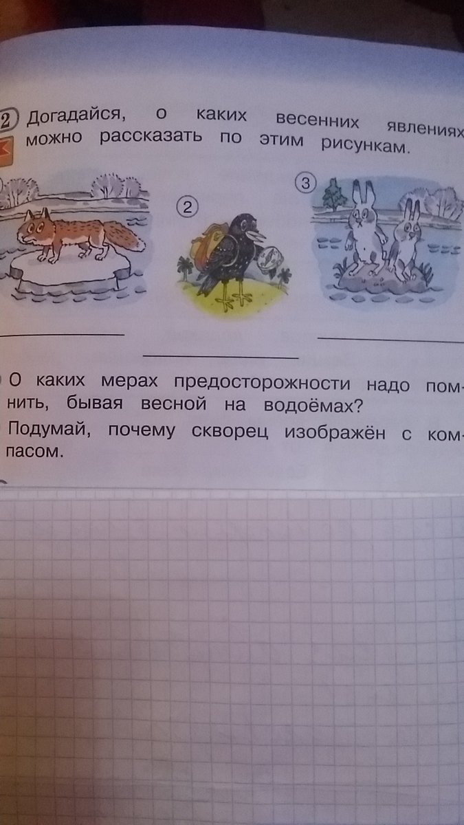 1) Весной тает лед и нельзя выходить на него т.к можно провалиться. 2)Скворцы прилетают весной с юга