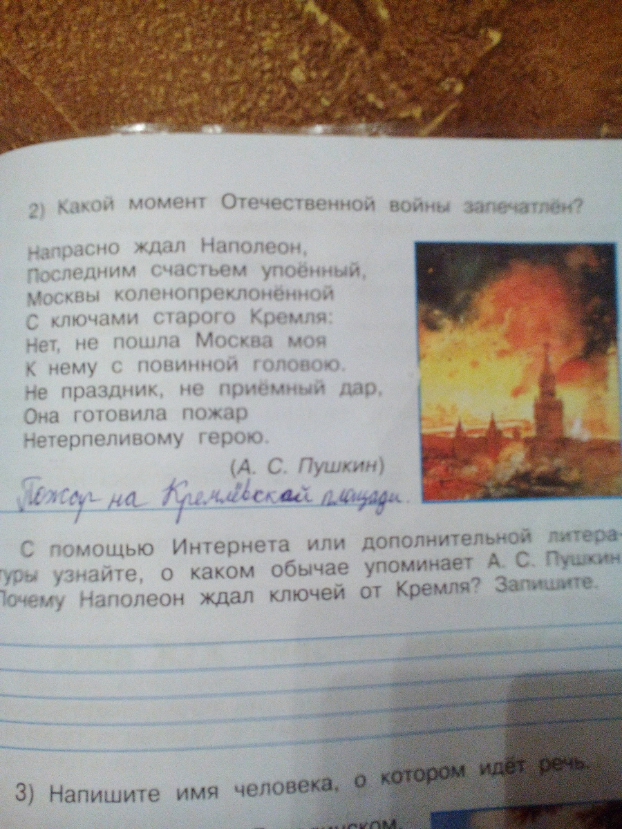 С помощью интернета или дополнительной литературы узнайте, О каком обычае упоминает А.С. Пушкин. Почему Наполеон ждал ключей от Кремля? Запишите.