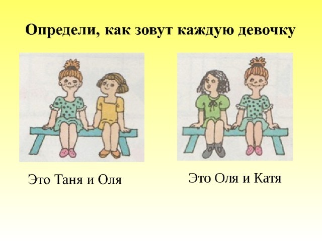 Оля есть на обеих картинках, поэтому девочка в голубом платье - Оля, значит, девочку в желтом платье зовут Таня, а девочка в зеленом платье - Катя.