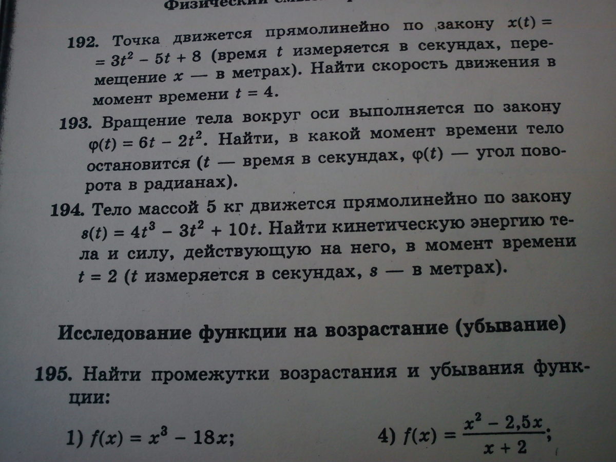 тело массой 5 кг движется прямолинейно по закону s(t)=4t^3-3t^2+10t. найти кинетическую энергию тела и силу, действующую на него , в момент времени t=2. ( t измеряется в секундах, s-в метрах) (на картинке номер 194)