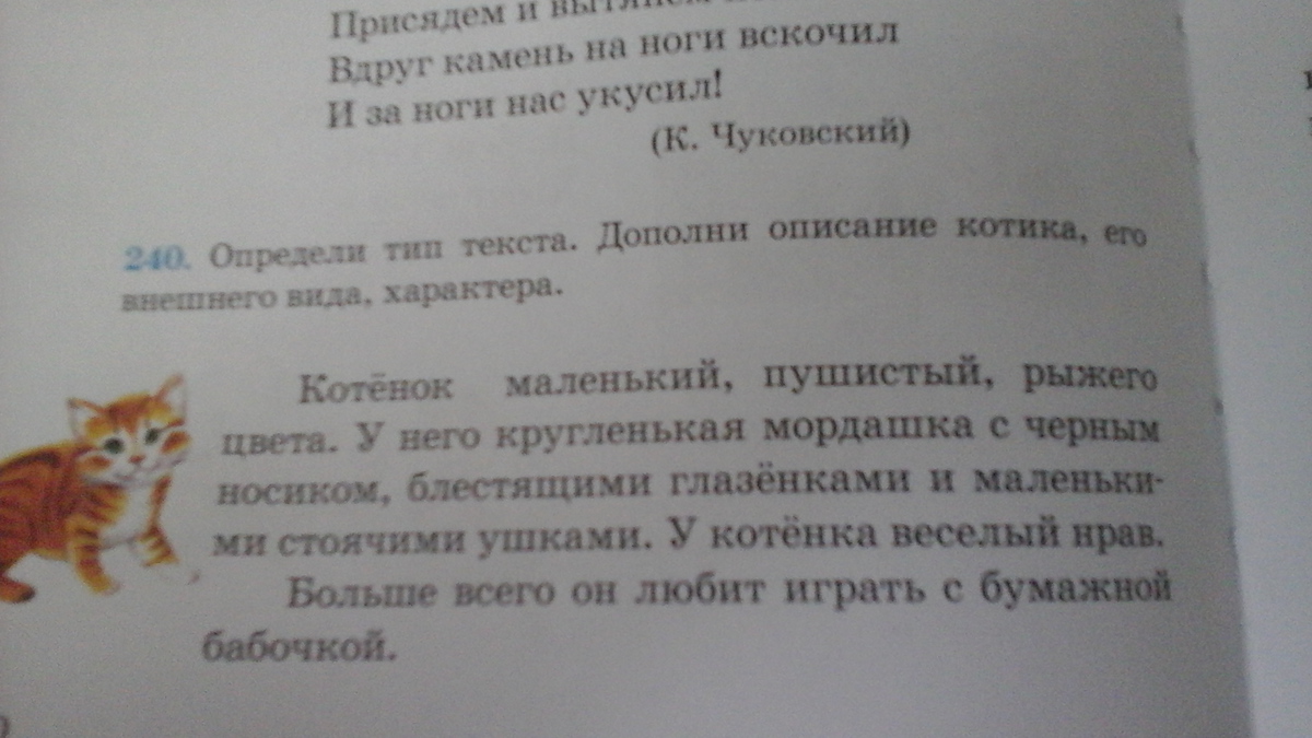 Тип текста-описание. Игривые глаза, вздернутые ушки(по желанию, мне самой не оч нравится это;)). белая шерсть на груди.