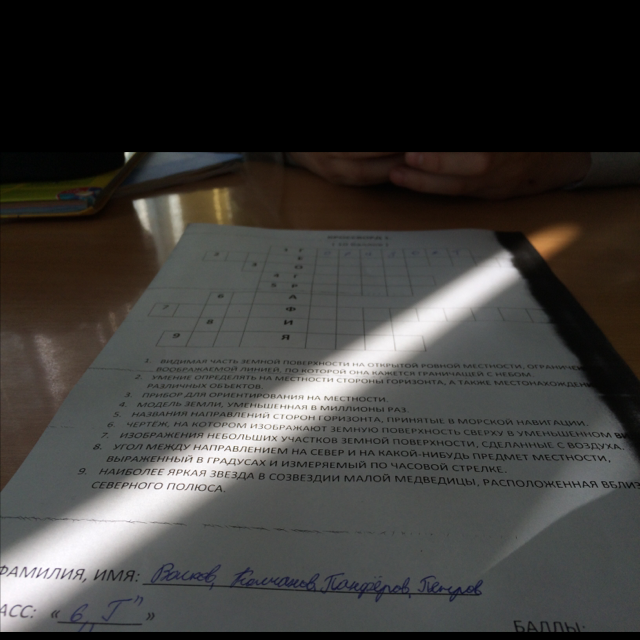 1. горизонт. 2. ориентирование. 3. компас. 4. глобус. 5. румбы. 6. план. 7. аэрофотоснимок. 8.азимут. 9.полярная.