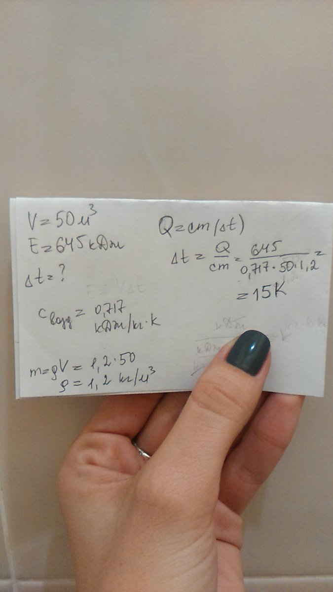 Для нагревания воздуха в комнате объемом 50 м³ затрачено 645 кДж енергии. Определить, на сколько градусов повысилась температура в комнате за счет этой енергии.