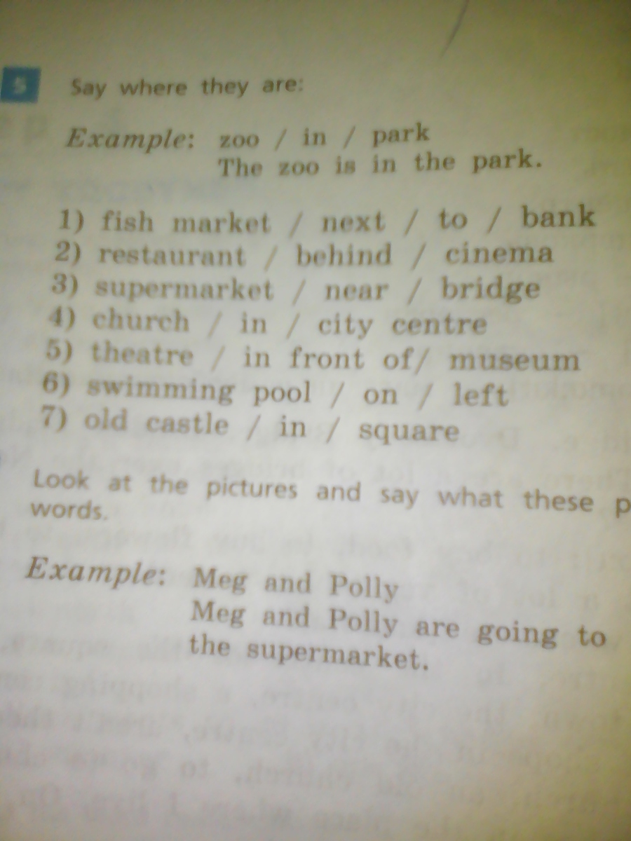 1) The fish market is next to the bank. 2) The restaurant is behind the cinema. 3) The supermarket is near the bridge. 4) The church is in the centre of the city. 5) The theatre is in front of the museum. 6) The swimming pool is on the left. 7) The old castle is in the square.