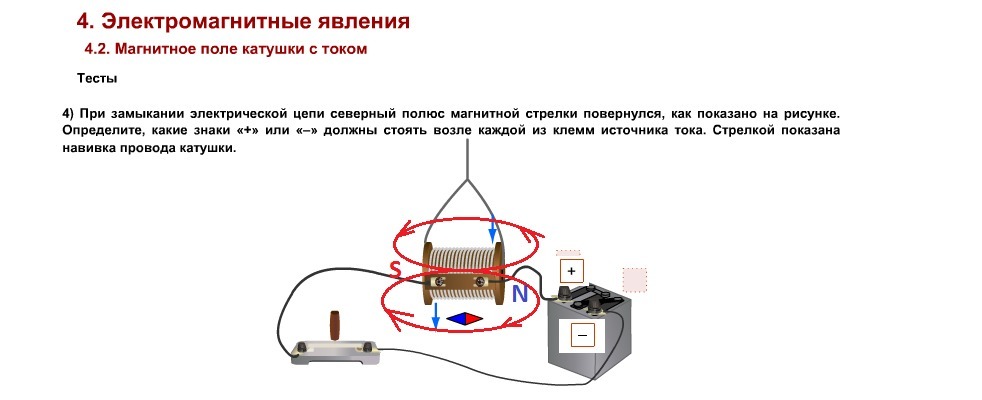 При замыкание цепи северный конец магнитной стрелки повернулся так, как показано на рисунке. Определите знаки клемм а и в источника тока. Стрелками показана навивка провода