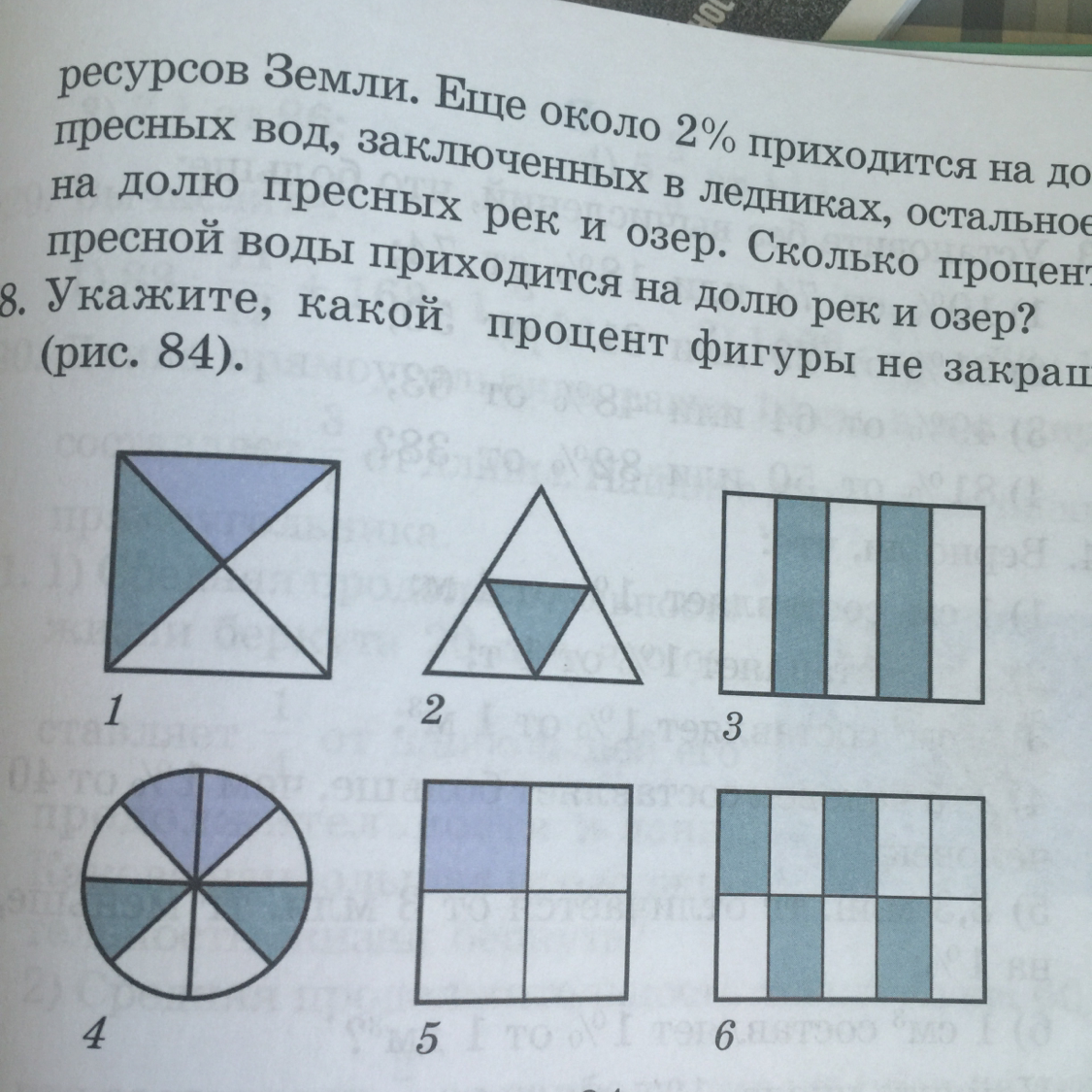 на первой фигуре не закрашено 50%, на второй фигуре 75%, на третьей фигуре 60%,на 4 фигуре 50%, на 5 фигуре 75%, на 6 фигуре 60%.