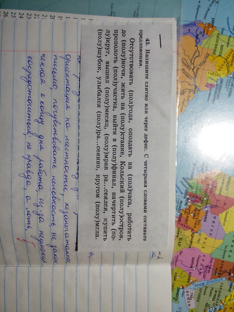 Полгода, полчаса, полуночи, полу-станке, полуостров, полустанке, пол-участка, полуфинал, полукруг, полумесяц, полумрак, рассеялся, полушубок, полу-рассеянно, полумгла.