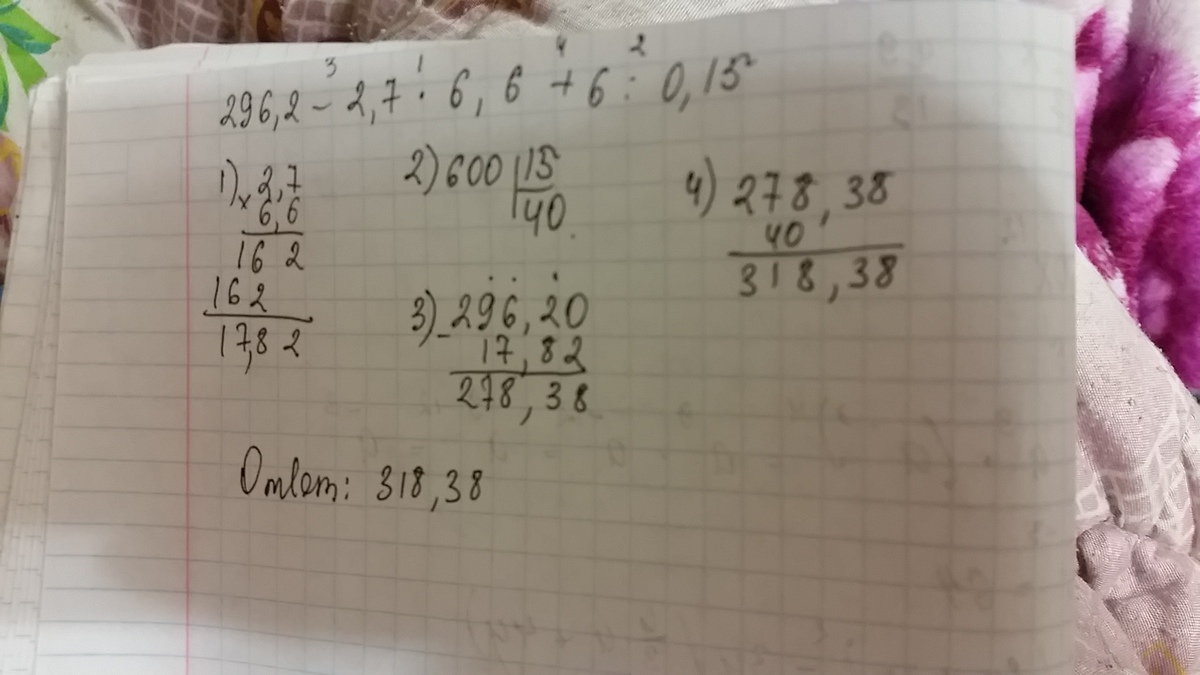 296,2 – 2,7 × 6,6 + 6 : 0,15