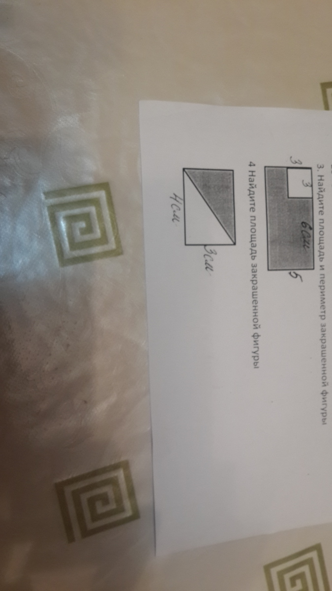 3. S1=6*5=30 см кв, S2=3*3=9 см кв, S закрашенной фигуры =30-9=21 см кв