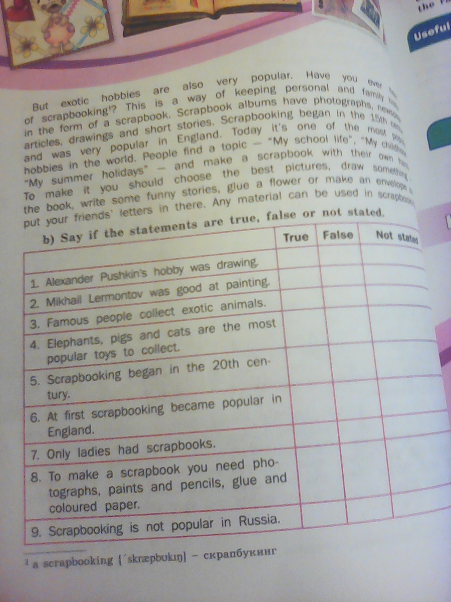 Но так же популярны экзотические хобби. Вы когда-нибудь слышали о скрапбукинге? Это способ хранить личную и семейную историю в виде альбома с вырезками. В таких альбомах есть фотографии, газетные статьи, рисунки и рассказы. Скрапбукинг начался в 15 веке и был очень популярен в Англии. Сегодня это одно из самых популярных увлечений в мире. Люди находят тему - «Моя школьная жизнь», «Мое детство», «Мои летние каникулы» - и делают альбом своими руками. Чтобы сделать его, нужно выбрать лучшие фотографии, нарисовать что-нибудь в книге, написать несколько забавных историй, приклеить цветок или сделать конверт и положить туда письма своих друзей. Любой материал может быть использован в скрапбукинге.